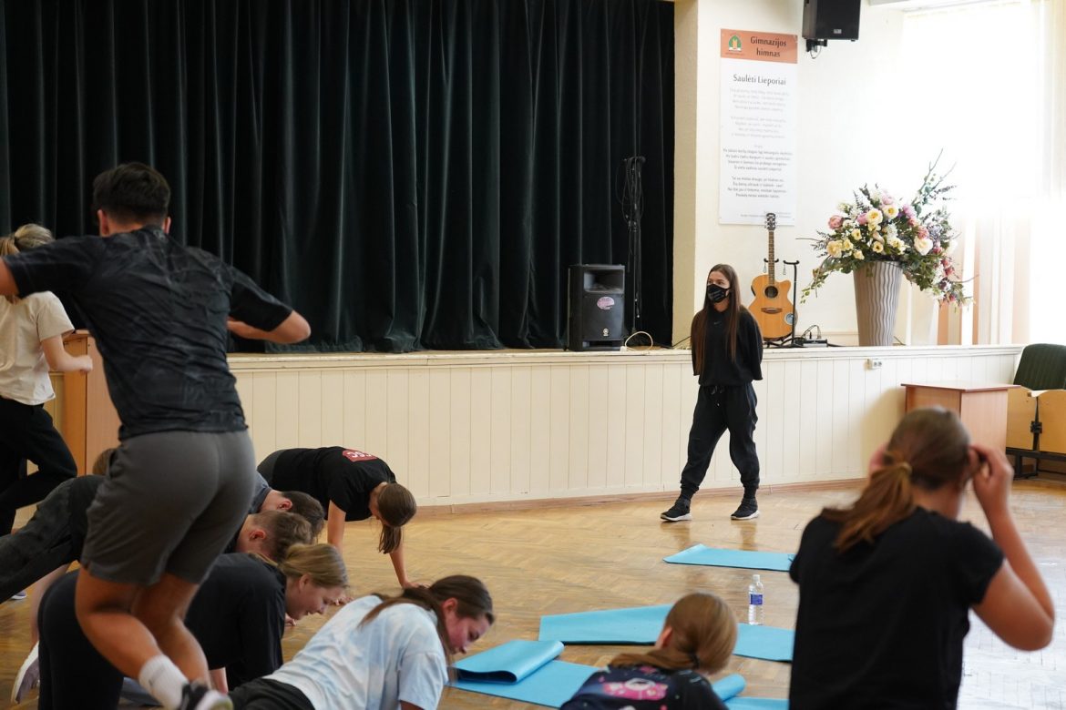Gimnazistai sportavo kartu su profesionalia trenere Mila Leonaviče, demonstruodami savo fizinį aktyvumą, išklausė kineziterapijos specialistės Deimantės Gedrimės patarimų – beje, smagu, kad Deimantė, baigusi mūsų gimnaziją, padeda rūpintis dabartinių gimnazistų sveikata skatindama jų fizinį aktyvumą. Tikimės, kad žinios, kurias įgyja dalyvaudami projekte, jo dalyviams padės stiprinti fizinę bei psichinę sveikatą, be to, jomis pasidalins ir su kitais- draugais, gimnazistais, šeimos nariais, nepamiršdami svarbiausio dalyko: ,,Tu tiesiog judi pirmyn. Kiekvienas pasiekia daugiau, jei laikosi šios minties“( Tedas Williamsas, beisbolo žaidėjas).